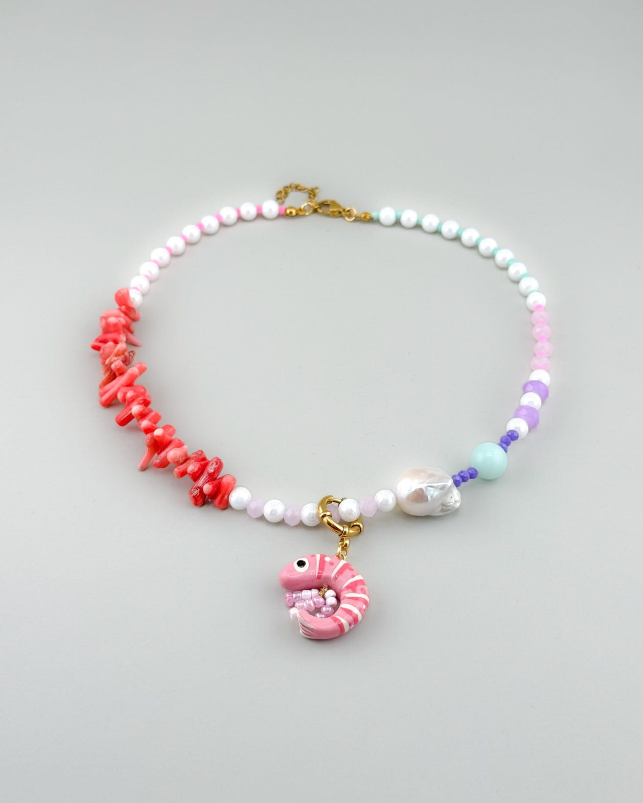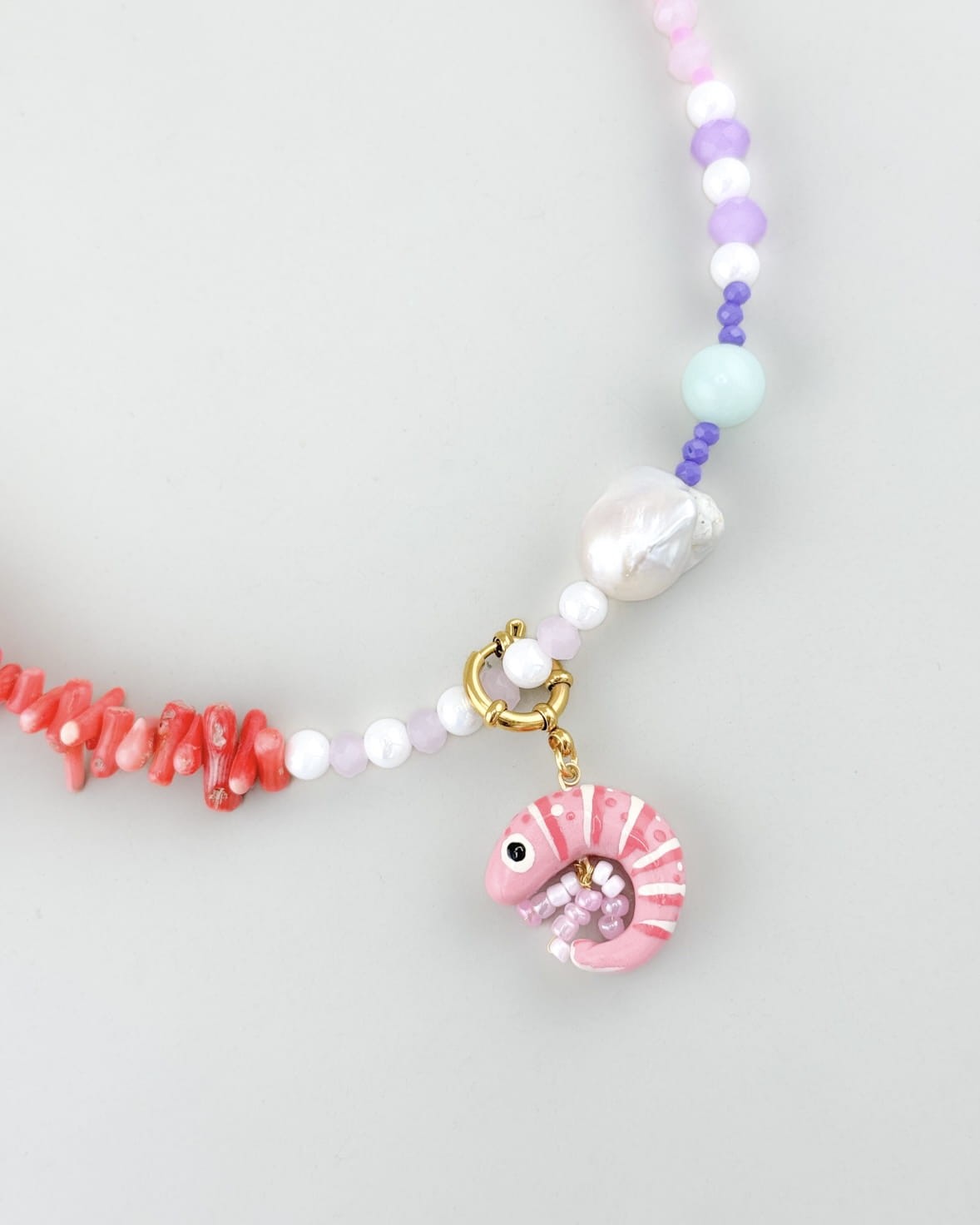 Zawieszony na środku charms z krewetką dopełnia całość i przyciąga spojrzenia, jak mały znak nadchodzących letnich dni. Przywodzi na myśl ciepło, słońce i tę lekkość, która pojawia się, gdy wszystko jeszcze przed Tobą. Możesz nosić go razem z naszyjnikiem albo odpiąć i stworzyć zupełnie nową wersję, bardziej minimalistyczną lub całkowicie swoją. Każda konfiguracja to inna historia.