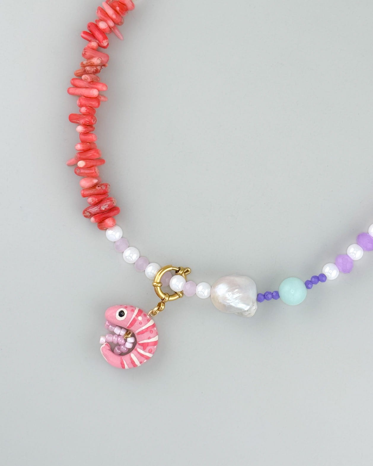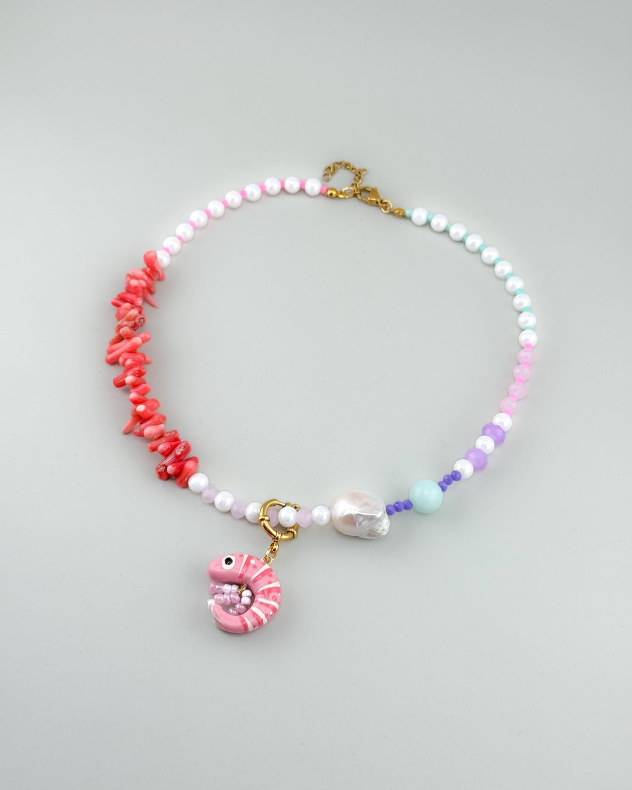 Koralowy Sen to bardziej miękka, świetlista odsłona podwodnego świata. Pastelowe kamienie, perła i intensywny koral tworzą kompozycję, która wygląda jak idealna wizja wakacji.